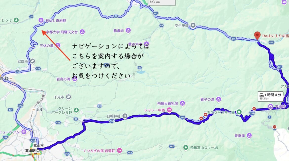 4. その後は通常通り国道158号線を平湯方面へ進み、途中で新穂高方面(国道471号線)へ入り、「おこもりの宿 夢流し」へ向かってください。